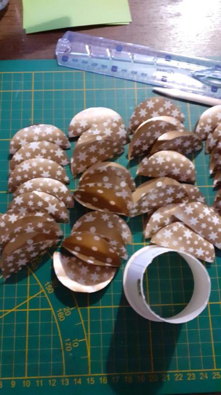 Il vous faudra 50 à 60 ronds de papier (nappe papier, reste de papier d'emballage...) que vous pouvez préparer plus rapidement en pliant plusieurs fois votre feuille.