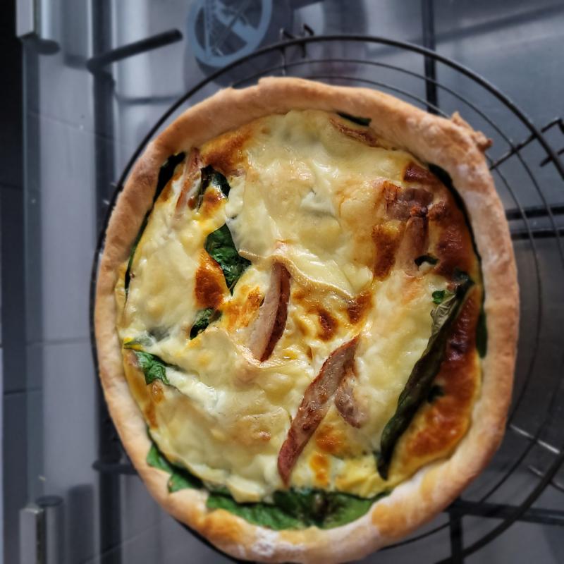 Dans le fond j'ai mis des feuilles d'épinard ( du jardin) Deux œufs mélanger avec un peu de crème sel poivre et verser Puis j'ai mis 3 tranches du fromage et laisser cuire 20 min a 190° Bonne soirée