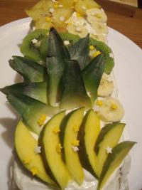 Au moment du dessert, sortez-la, répartissez sur tous les côtés de la crème fouettée parfumée au rhum vieux (faite maison si possible sinon ajoutez le rhum à votre chantilly toute prête) et décorez votre bûche selon vos envies avec les feuilles d'ananas, des rondelles de kiwis, une carambole coupée en lamelles pour faire des étoiles, des rondelles de banane, des fines tranches de mangue et des étoiles sucrées (en commerce).
