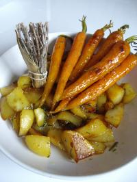 300 g de petites pommes de terre (type rattes) 3 minis carottes 3 minis courgettes 4 cuillères à soupe de miel 3 cuillères à soupe d'huile d'olive Thym Sel et poivre