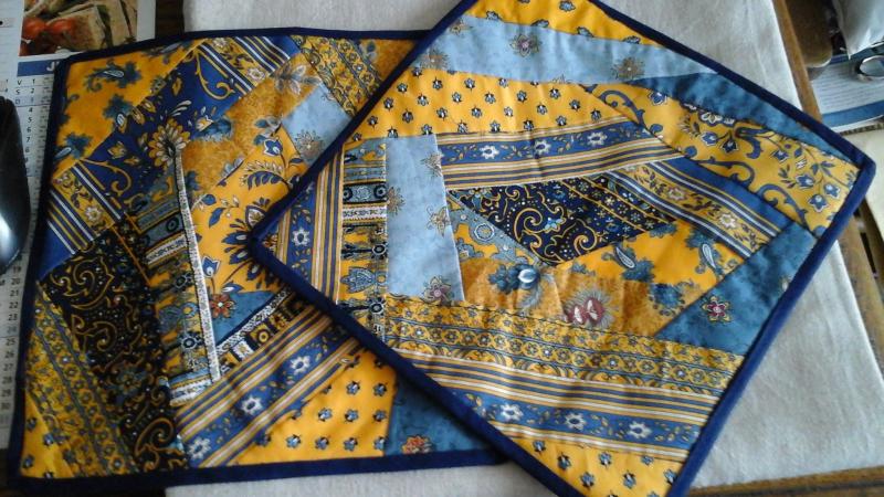 Envelloppe remplie de deux jolies maniques faites par Monique du blog DÉCOUVERTE DE LA PROVENCE accompagnés d'une jolie carte porteuse d'un gentil message