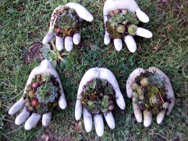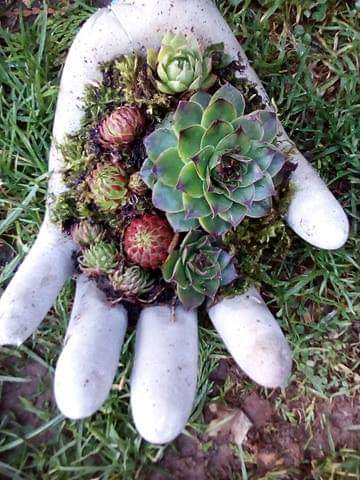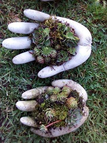 Les mains en bêton  sont garnies de petites plantes