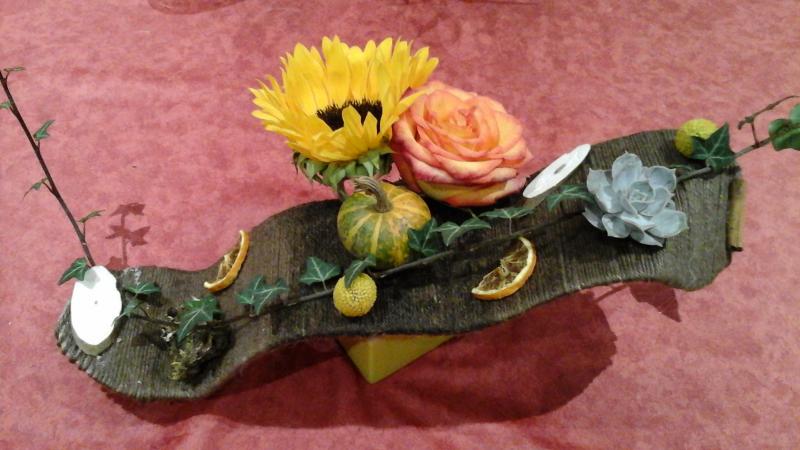 En ce début Novembre le thème était l'automne Nous somme partit d'un morceau de carton rigide On a agrafé du fil recuit Recouvert de cordre lin Ensuite la magie des fleurs et décos opére