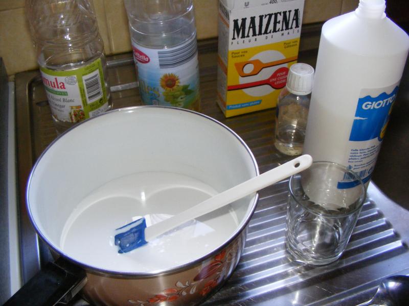 Mélanger dans un saladier (ou dans une casserole en Téflon) 3 tasses de Cléocolle* chez Leclerc loisirset 3 tasses de Maïzena**. Ajouter 1 CS de vinaigre d’alcool blanc, 1 CS de glycérine***, 2 CS d’huile de colza. Mélanger soigneusement avec une cuillère en bois. Cuire au micro-ondes ou dans une casserole. Cuisson au micro-ondes : Placer le saladier au micro-ondes pendant 2 à 3 minutes au maximum de la puissance (pour un micro-ondes de 800W). Adaptez le temps en fonction du micro-ondes. Arrêtez toutes les 30 secondes pour mélanger. Pour les dernières 30 secondes, faire des arrêts toutes les 10 secondes pour surveiller la pâte. Dès que la pâte devient épaisse et grumeleuse (comme de la ricotta), arrêtez la cuisson. Cuisson dans une casserole : Placer la casserole sur un feu doux pendant environ 15 minutes. Remuez avec une cuillère en bois. Dès que la pâte épaissit et devient grumeleuse (comme de la ricotta), se décolle des bords, retirer du feu. La cuisson est la seule opération délicate de cette recette. Il faut cuire la pâte pour qu’elle épaississe elle devient homogène et souple. Faire une grosse boule et la placer dans un récipient hermétique. Laisser la pâte de côté pendant 24 heures avant de l’utiliser.