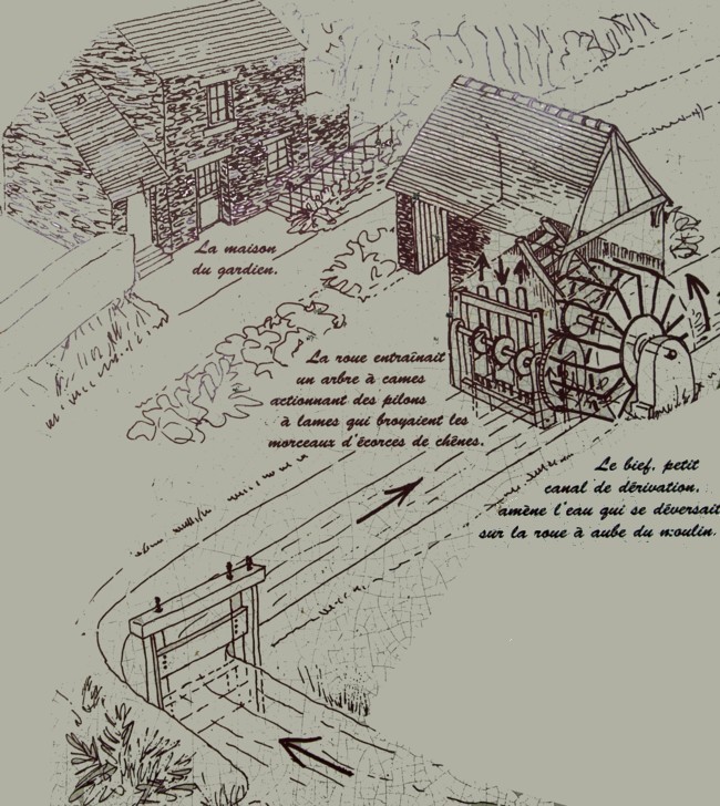 Le Moulin à Tan Celui de Rouvrou, construit en 1820, appartenait à une tannerie. Il broyait l'écorce des jeunes chênes, qui une fois réduite en poudre, servait au tannage des peaux. Les peaux étaient séchés dans un bâtiment aéré aujourd'hui disparu. L'écorce des jeunes chênes de 20 ans est très riche en acide tannique. En la broyant, on obtient le tan, véritable astringent que l'on emploie pour resserrer les peaux et les rendre imputrescibles. A partir des années 1910, les produits chimiques (chrome) le remplaceront. La première étape, l'écharnage, consistait à ramollir les peaux et à les débarasser de leurs poils dans un premier bain de tan usagé. Puis, elles macéraient environ 18 mois dans des cuves contenant de la soupe de tan (mélange d'eau douce et de tan neuf). Les cuirs étaient ensuite battus, séchés et brossés, avant d'être travaillés à Rouvrou pour la confection des harnais.