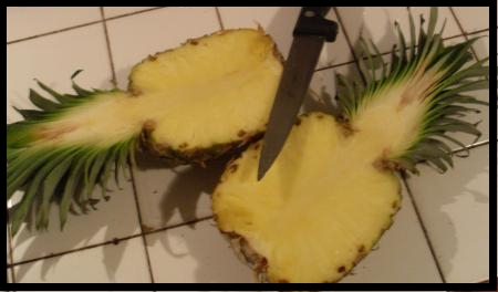 Tranchez l'ananas en deux dans le sens de la longueur en conservant ses feuilles vertes.