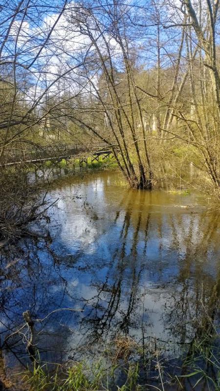 Notre balade commence.  Le moulin reste caché derrière les arbres, mais tout autour, la nature raconte déjà son histoire.