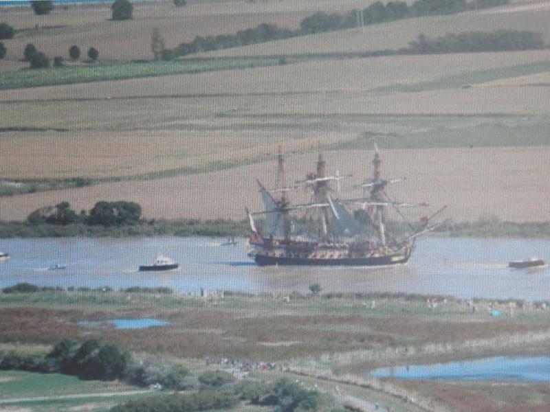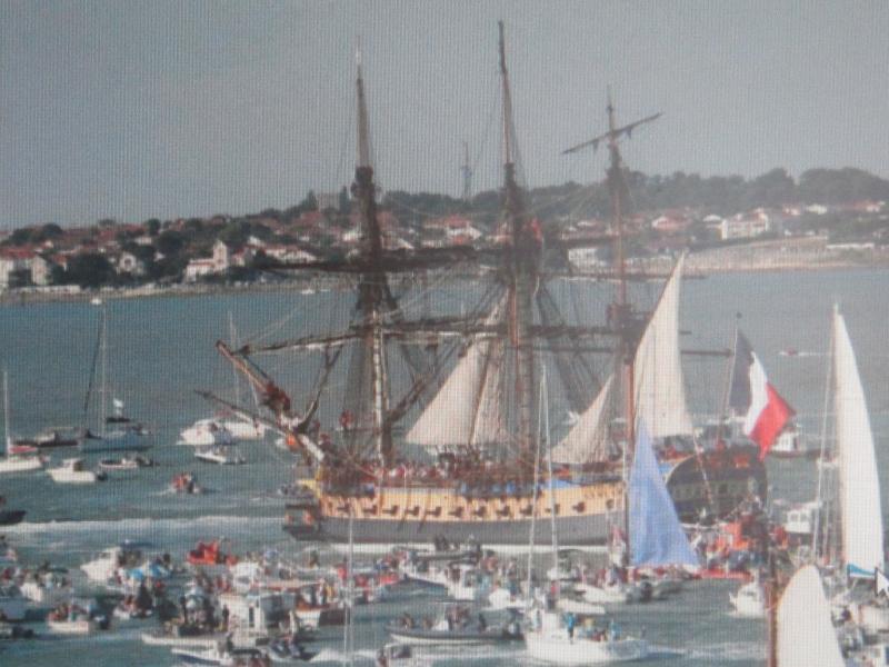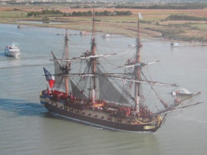 très belle reproduction de la frégate ,exécutée a Rochefort. longeur 44m poids 1,166tonnes tirant d'eau 5,78m plus de 200ans aprés LAFAYETTE,l'Hermione a pris la mer pour l'île d'aix . ,apres 17ans de travaux.