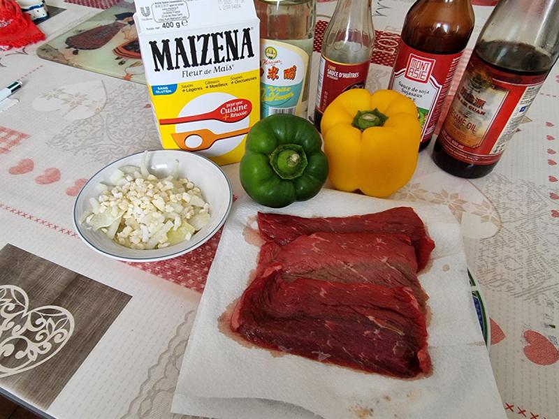 (4 personnes - temps d'attente 30 minutes - préparation et cuisson 30 minutes) -300g de boeuf -2 poivrons -1 oignon -1 gousse d'ail -4 càs de sauce de soja claire (2 + 2 pour la sauce) -1 càs de vin de cuisine shaoxing -1 càs de sauce huitre -1 càs de fécule de pomme de terre (+ 1/2 cuillère à café pour la sauce) -huile de sésame