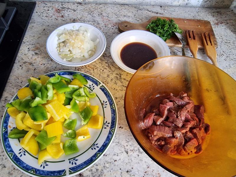 Aujourd'hui, c'est Nicolas qui cuisine et il s'est inspiré de la recette "Boeuf sauté aux poivrons" du site "Le Riz Jaune" !