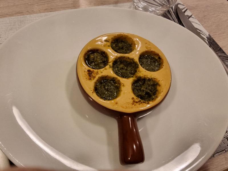 En entrée, Marc est heureux de pouvoir déguster une assiette d'escargots.