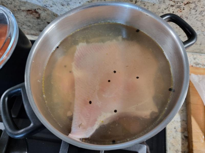 Incorporez les grains de poivre, la feuille de laurier et le vinaigre. Faites pocher les ailes de raie dans le court-bouillon maintenu à petits bouillons pendant 10 minutes.