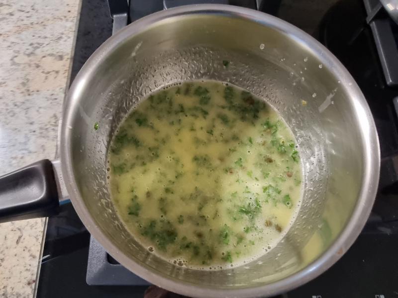 Lavez, séchez et hachez le persil. Égouttez les câpres. Pressez le citron. Faites fondre le beurre dans une casserole. Ajoutez le jus du citron, le persil et les câpres. Remuez puis retirez du feu.