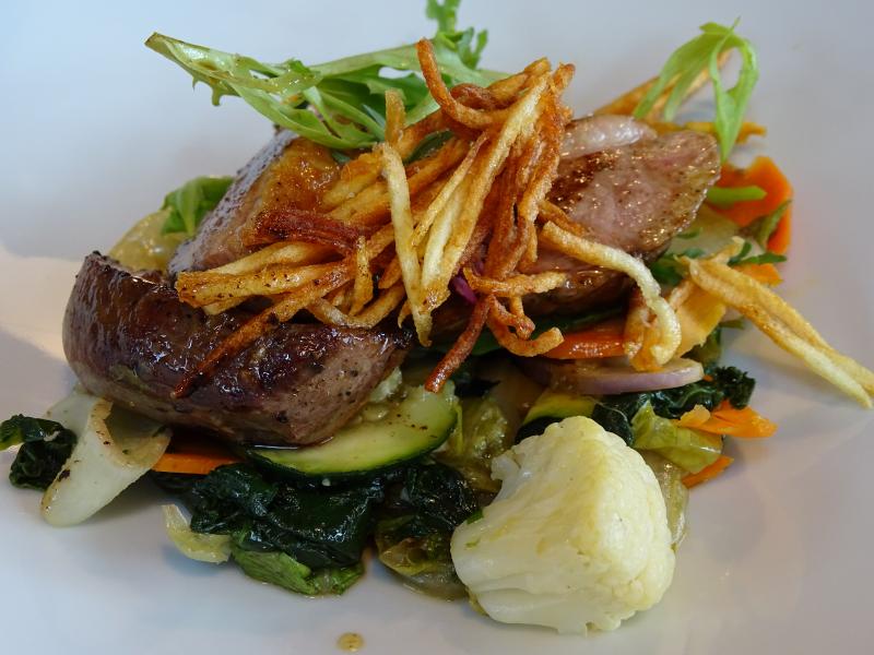 maquereaux marinés sur pousse de salades variées aiguillettes canard et ses légumes de printemps