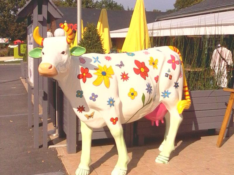 devant la terrase d'un resto une vache aux couleurs éclatantes