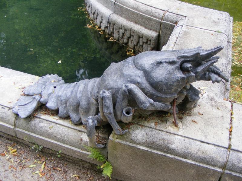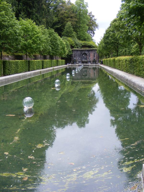 trés ingénieux !! Trévarez. L'eau y est un élément important : on sait qu'un réseau sophistiqué de conduites, de réservoirs et de pompes y a été établi pour l'alimentation des bassins, des cascades et des jardins. Des bulles d'eau, symbolisant la masse d'eau sur terre, émergent du bassin de la chasse tandis que le visiteur est invité à marcher sur une citerne de 55 mètres cubes d'eau (la consommation annuelle d'un Français), symbole de son empreinte écologique. Le photographe et sculpteur François Méchain est inspiré par les remarquables points de vue qu'offre le parc ainsi que par l'histoire hors du commun de ce domaine et imagine des oeuvres dialoguant avec le bâtiment et la nature environnante. Une imposante " cage à oiseau " posée sur la prairie en face du château domine le jardin revisité par l'artiste pour en faire un " jardin des monnaies ".
