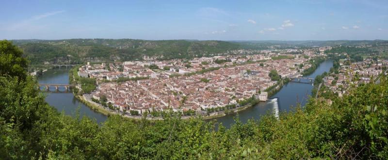 Les berges du Lot, les hauteurs du camp des Monges, le point de vue du Mont St Cyr offrent de nombreux panoramas sur Cahors, attrait conjugué de la ville médiévale et des espaces natuturels.Depuis le Mont Saint-Cyr, le regard, en embrassant l'ensemble de la boucle du Lot dans laquelle s'inscrit la ville de Cahors, peut saisir l'histoire de sa construction de la ville. Côté est, au pied de la colline, c'est le Cahors médiéval, forêt de toit roses parcourue de rues étroites. Au nord de ces quartiers anciens, on aperçoit la cathédrale Saint Etienne et ses toits en coupole couverts d'ardoises.Au centre, le boulevard Gambetta, repérable par une ligne d'arbres, était au XIIème siècle un rempart. source du web |