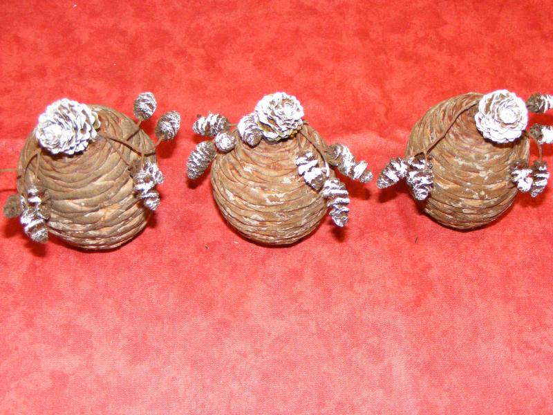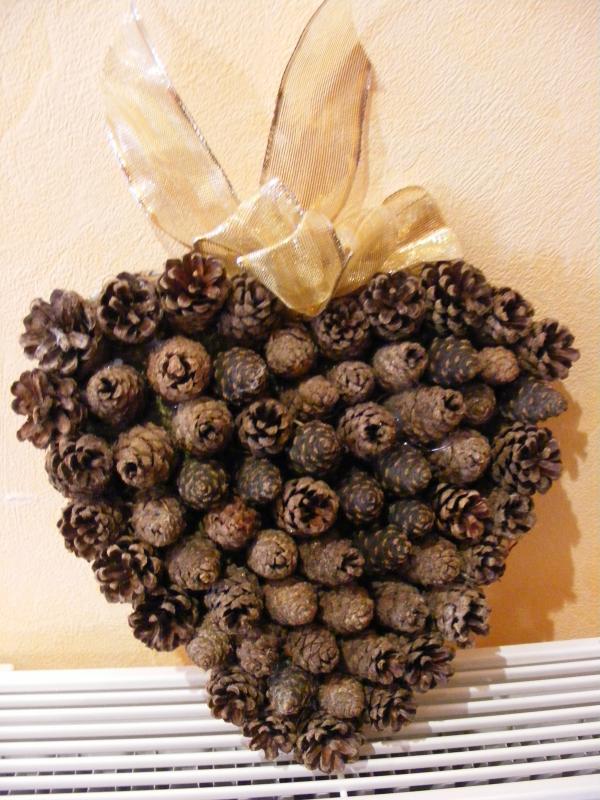 un beau ruban doré pour ce gros coeur en pommes de pins