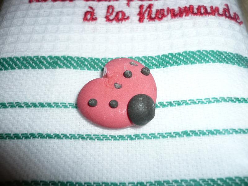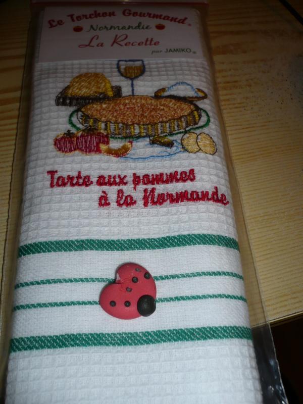 un torchon avec la recette tarte à la normande je vais la faire et vous donner la recette 1 carte personalisée avec Coccinelle 1 Coccinelle en pâte de sucre je ne sais pas si elle se mange?
