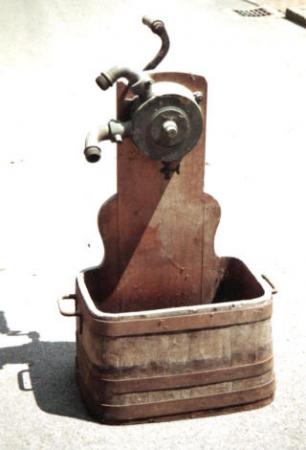 1-objet de vigneron, ancienne pompe à vin en bronze vissée sur seau en bois 2-