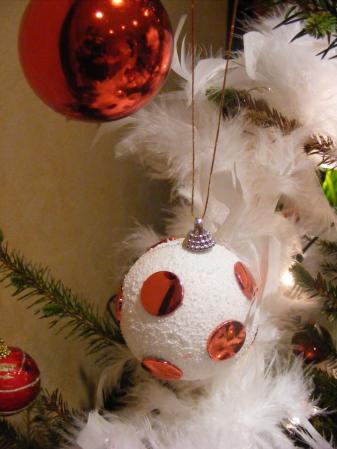 une boule polystyréne roulée dans de la neige synthétique et des pastilles découpées dans du paier cadeaux brillant
