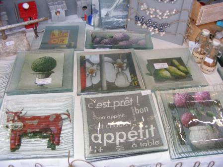 içi ce sont des assiettes transparentes on applique une serviette de son choix que l'on enduit de colle vernis... ensuite laissez sécher et passer une couche de vernis de marine! pas mal non!