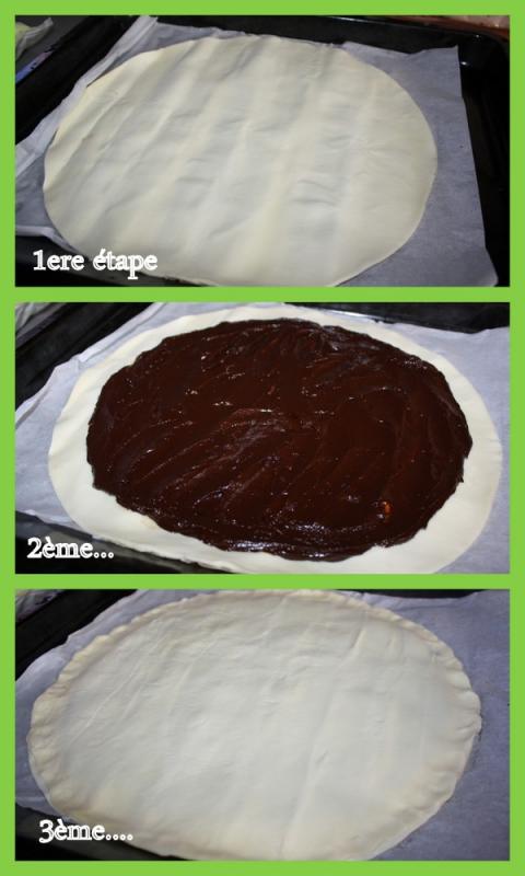 Faites fondre le chocolat au bain-marie, mélangez-le au caramel au beurre salé, (légèrement tiédi pour le rendre moins ferme), mélangez bien ces 2 ingrédients et étalez-le uniformément sur la pâte feuilletée, en laissant vierge un pourtour de 2 cm.