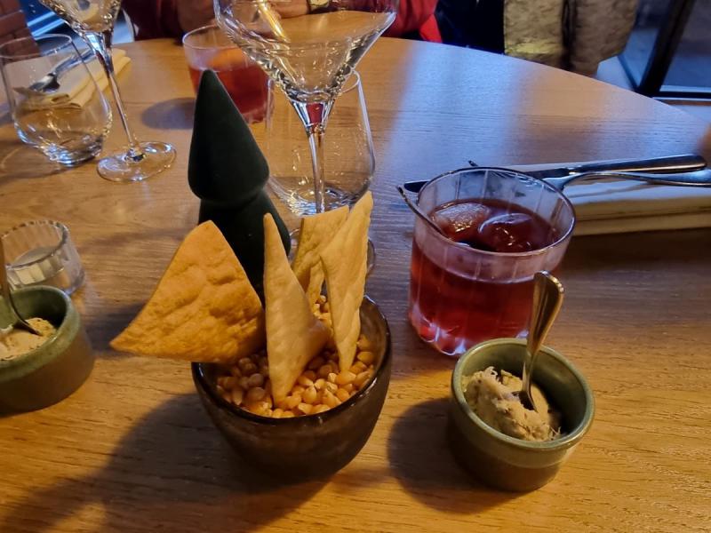 L'apéritif est accompagné de crackers maison et de rillettes de lapin.