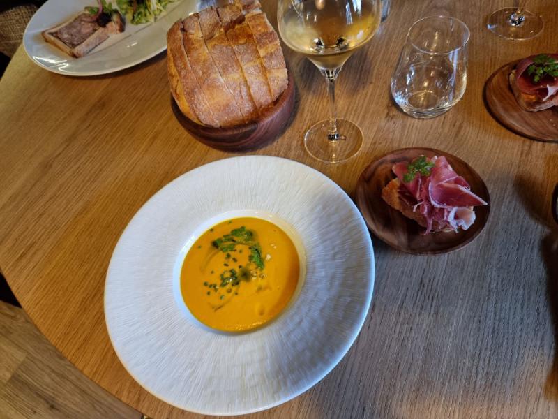Pour les entrées, nous fûmes trois à goûter le velouté de potimarron, éclats de noisette, tartine de pain de campagne grillée et jambon de truie du Pays Basque.