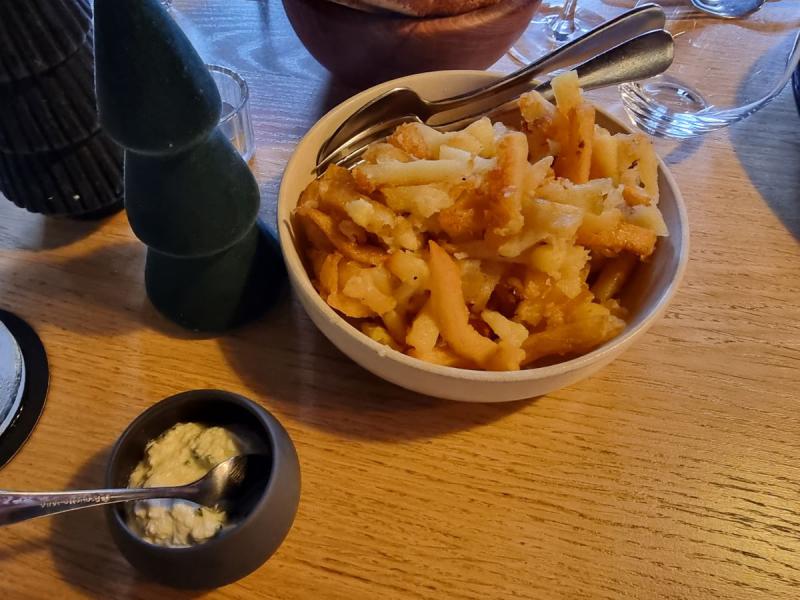 Nos plats furent accompagnés de pommes de terre rôties ainsi que d'un fromage aillé et persillé !