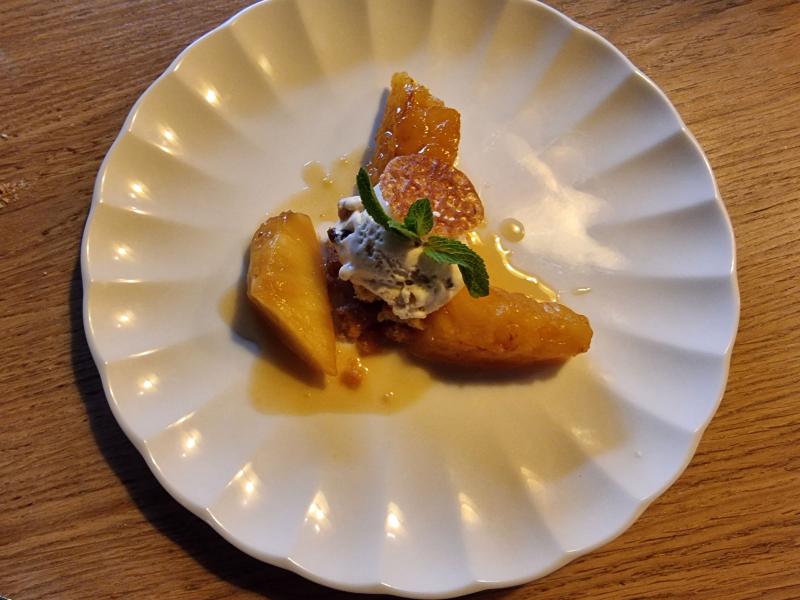 Marc décide de goûter l'ananas caramélisé et flambé et sa glace rhum-raisins.