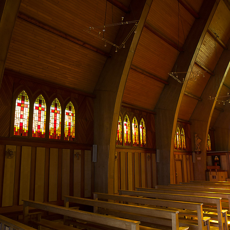 Remontons au mois de juin 1944. Le village de Lavancia , blotti contre la montagne, à trois kilomètres de la rive gauche de la Bienne,est envahi par les troupes allemandes harcelées par les maquisards. Le village est brûlé en représailles, laissant les habitants dans le plus grand des dénuements. Seule la vieille église est épargnée par les flammes. En 1946, les services de la reconstruction dressent le plan d’urbanisme d'un nouveau village qui se trouve cette fois, à la demande des habitants, le long de la route principale entre Bourg-en-Bresse et Saint-Claude, dans "la plaine" pour rejoindre plus facilement les villes voisines demandeuses de main-d’œuvre. C'est ainsi que le village neuf se trouve à plusieurs kilomètres du village dévasté. La vieille église, beaucoup trop éloignée, et ne bénéficiant pas des aides à la reconstruction, est abandonnée, vendue à des particuliers et tombe en ruines. CLIC ! Lavancia se retrouve sans clocher. La commune et la paroisse n'ont pas les moyens de financer la construction d'une une nouvelle église. En octobre 1951, Edgar Faure, député du Jura et ministre du budget, lors de sa visite de l’exposition internationale du bois à Lyon, admire une église toute en bois, chef-d’œuvre de l’exposition. A l'issue de cette exposition, l'église doit être tout simplement....détruite ! Edgar Faure réussit à obtenir la gratuité du don, du démontage, du transport et du remontage du monument à Lavancia, le tout en quelques semaines ! Un véritable tour de force. L'église est consacrée en juin 1952. "De cette symphonie du bois, naît l’atmosphère de recueillement propice à la prière " ainsi parle Monseigneur Flusin à cette occasion. Faisons le tour de l'édifice, de dimensions modestes (20 m sur 10)
