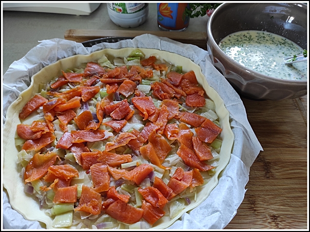 6 - Déposer la préparation à base de poireaux puis la truite fumée coupée en dés sur la pâte à tarte.