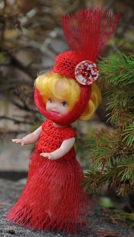 Je ne trouvais pas de nom pour cette tenue bien avancée dimanche dernier mais il me fallait le coup de pouce de mon chéri pour la terminer ce matin. Comme je commence à travailler demain, j'aurais certes moins de temps pour tricoter, je voulais donc la terminer et mettre ici les photos Il faut avouer que je récupère toujours tout un tas de choses en me disans ca va peut etre servir. Pour le chapeau je me suis servi d'un bouchon pour les mini pack de crème fraiche auquel mon homme à retirer les "oreilles", d'un bouton récupéré dans la boite à boutons offerte par mon ex voisine, et le filet rouge d'emballage des oranges (en plastique pour la raideur) Pour la robe j'ai crocheté le haut et j'ai utilisé à nouveau le filet rouge.