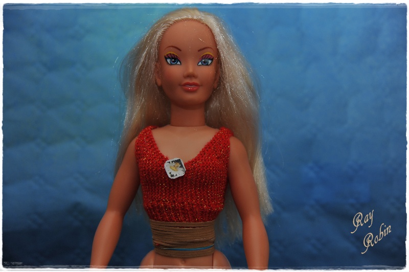 J'avais donc fabriqué ce petit haut pour Eva-Lyne sans l'avoir sous la main, à l'arrivée il était trop juste pour elle. Je l'ai essayer à ma poupée Jesmar, et ca lui va. J'en ai fait cadeau à Doliane, esperons qu'il aille à sa poupée sd. les mini broches sont une fabrication maison.