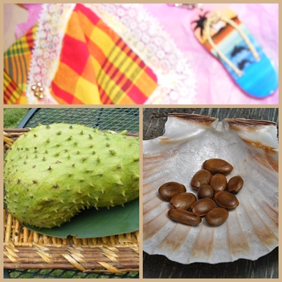 Corossol (Annona muricata L. )Originaire d’Amérique tropicale, il se répand à travers la Caraïbe au 17ème siècle à partir de l’île de Curaçao alors appelée Curasso ou Corossol. Il en gardera le nom. C’est un des premiers fruits que Colomb introduit dans l’Ancien monde. Il s’accommode d’un climat chaud et humide, et d’un sol drainant. C’est un petit arbre au port globuleux dépassant rarement 8 m. Ses feuilles coriaces, à l’odeur épicée, sont allongées et d’un beau vert-foncé luisant. Sa fleur possède 3 sépales jaune-verdâtre triangulaires qui lui donnent l’aspect d’une clochette. Son fruit, à la forme de cœur allongé est hérissé d’épines molles. Il peut peser jusqu’à trois kilos ! De couleur vert-foncé, sa peau devient vert-jaune à maturité. Sa chair blanche et molle est parsemée de graines noires.