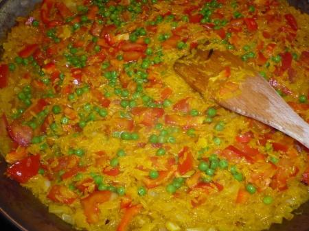 Le repas était une paëlla Faire revenir les oignons et l'ail dans de l'huile d'olive