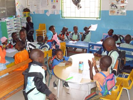 Ici, elle encadre un groupe d'élèves dans la classe de GS de tata Khady |