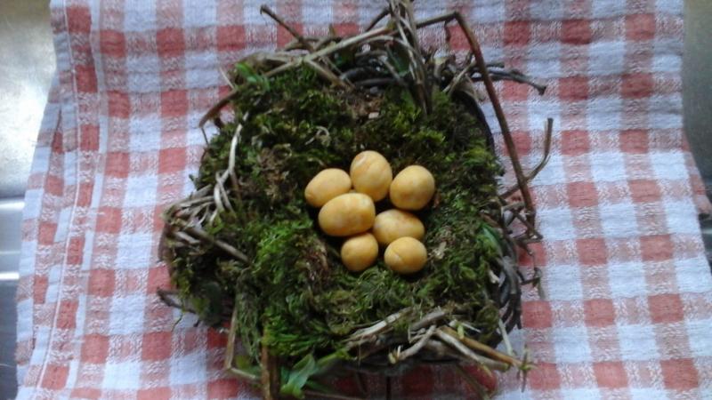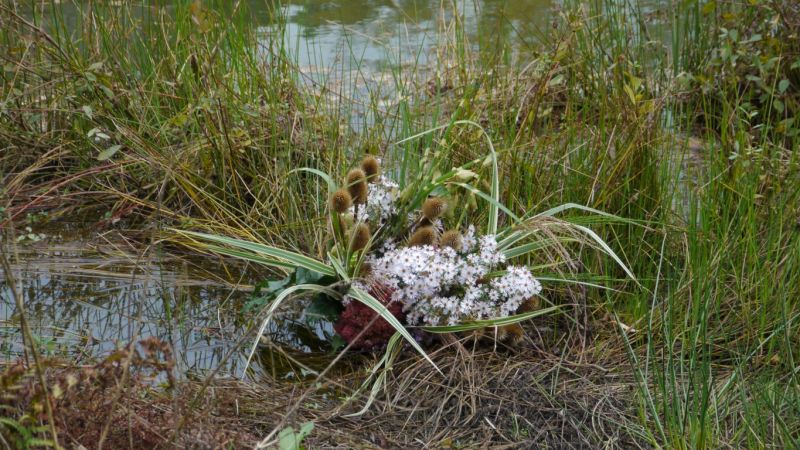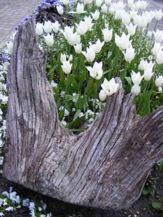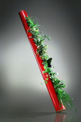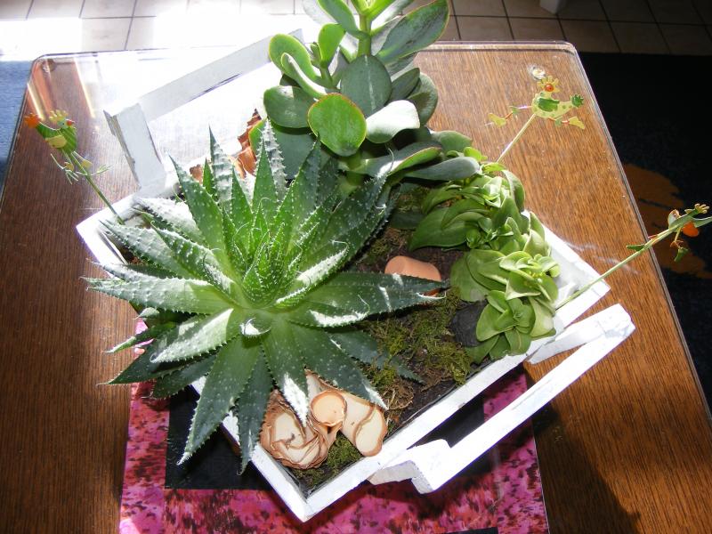 vous pouvez faire la même chose avec un gros morceau de bambou faire de gros trous de plaçe en plaçe et y mettre un peu de terre ou mousse florale trempée avant! des petites plantes ou fleurs de votre choix!!!
