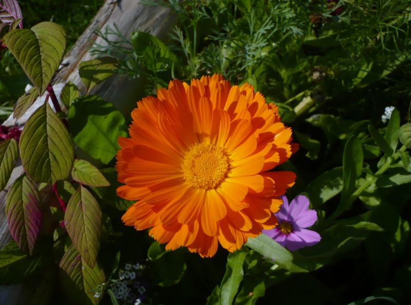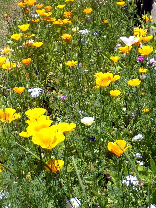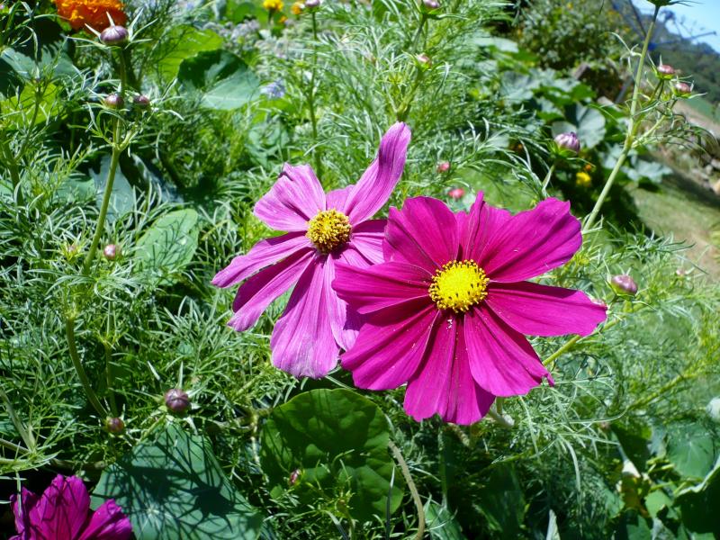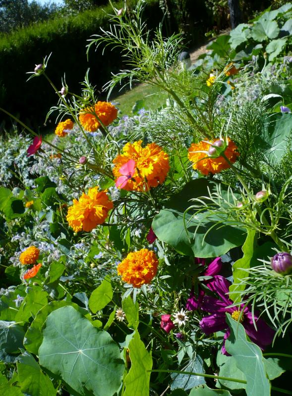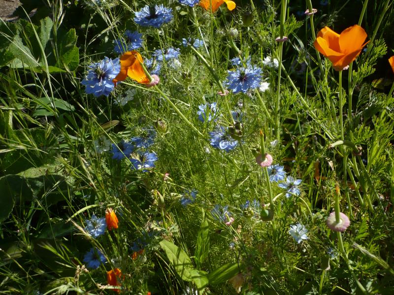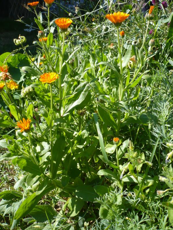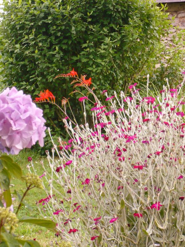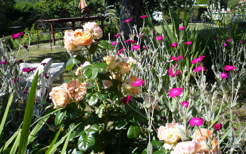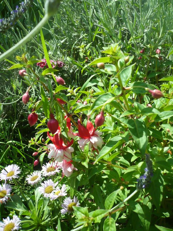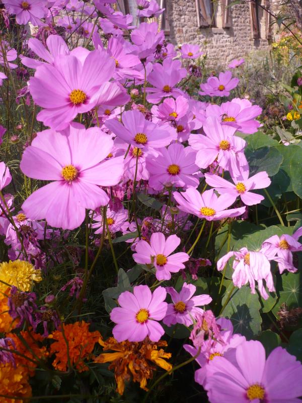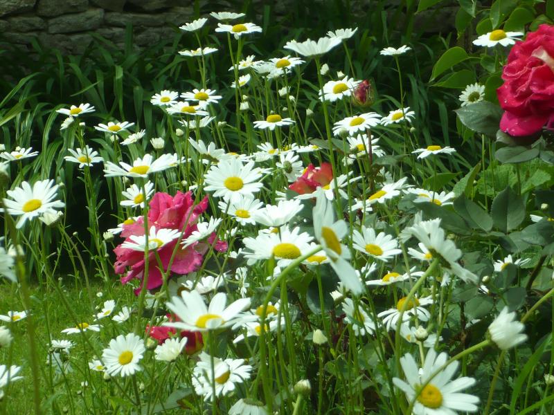 Là ce sont des oeillets de poète qui s'ouvrent, il y en a de plusieurs couleurs ! Il y a plusieurs années, j'ai cueilli des marguerites dans les champs, je les ai repiqué au jardin, quand elles se flétrissent, je sème les graines, voilà le résultat !