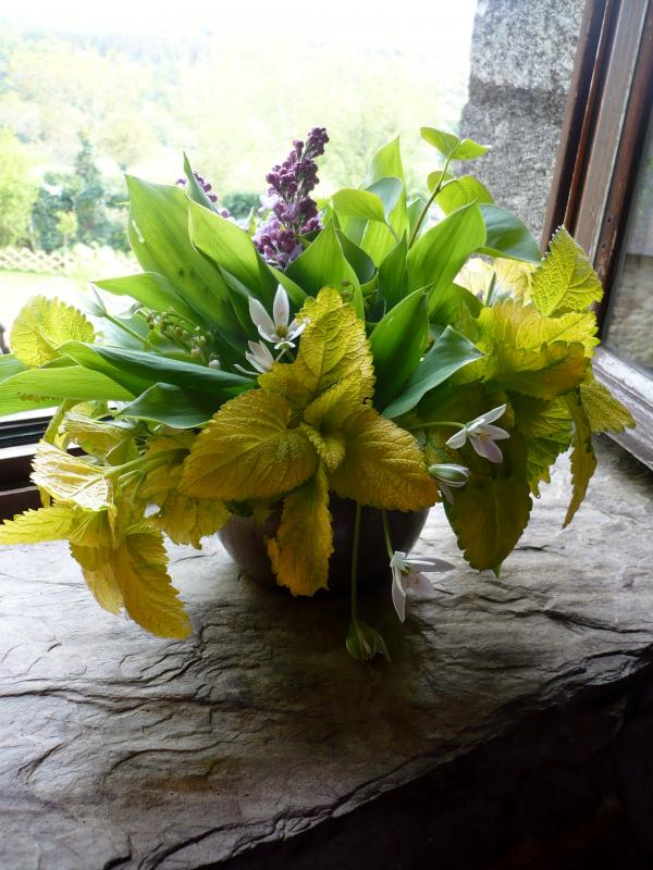 Sur le bord de la fenêtre, lilas, muguet du jardin.