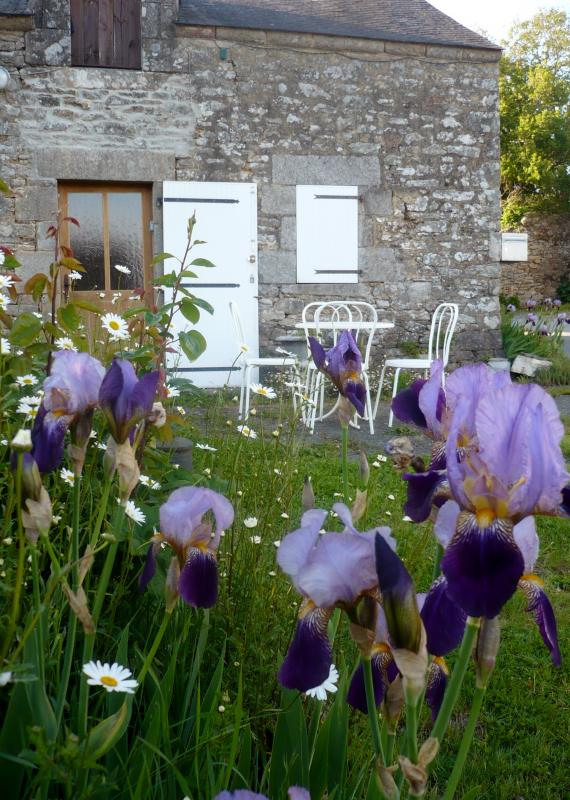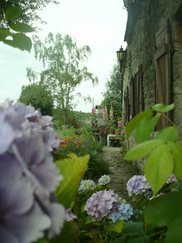 Là sur le devant de la grange, mon mari à installer une réserve d'eau, moi je commence un chemin d'ardoise, ou j'ai repiquer une bouture d'hortensia de chaque côté, rosier, bulbes, il y a déjà des gros iris et primevères qui fleurissent au printemps !