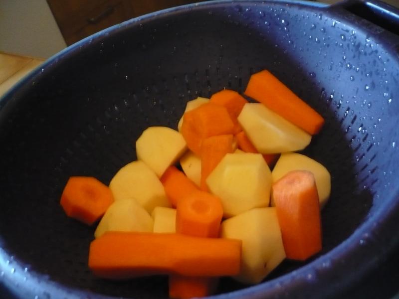 4 pommes de terre 500 grs de carottes 1 boule de céleri 1 à 2 cubes (poulet pour moi) 1 à 2 litres d'eau 1 filet d'huile d'olive 1 gros oignon Après avoir épluché vos légumes, les couper en morceaux,