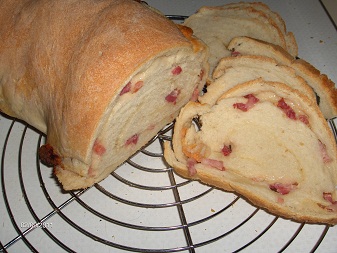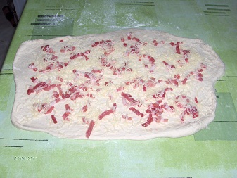 Ingrédients : - 1 pâte à pain ( - lien vers la recette - ) - 1 sachet de lardons ou de dés de jambon - 1 sachet de fromage râpé Préparation : * Faire une pâte à pain (à la main ou à la machine) et la laisser monter. Ici, je l'ai faite avec le programme 'Pâte' de la MAP. * L'étaler en rectangle. * Étalez dessus les lardons (ou jambon) et le fromage.