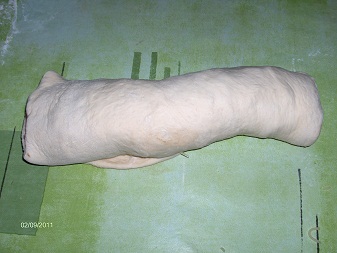 * Mélangez tous les ingrédients de la garniture. * Etalez la pâte en formant un rectangle de 30 x 70 cm. * Enduisez de la garniture.