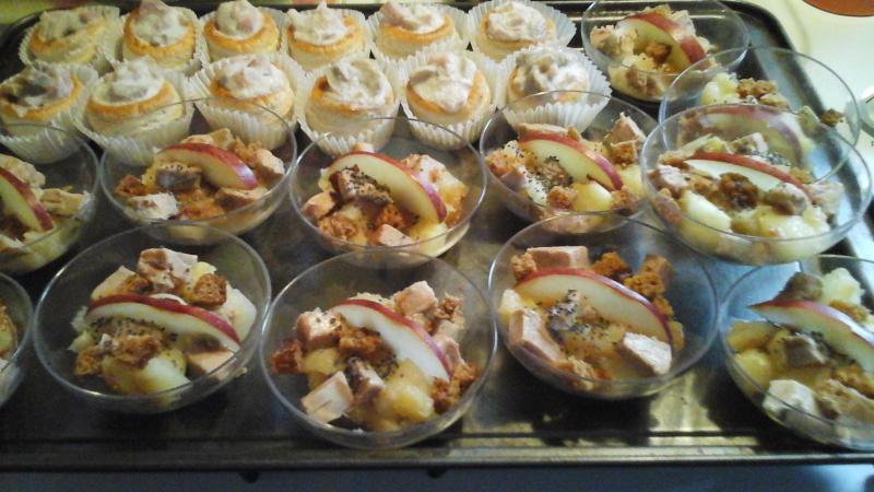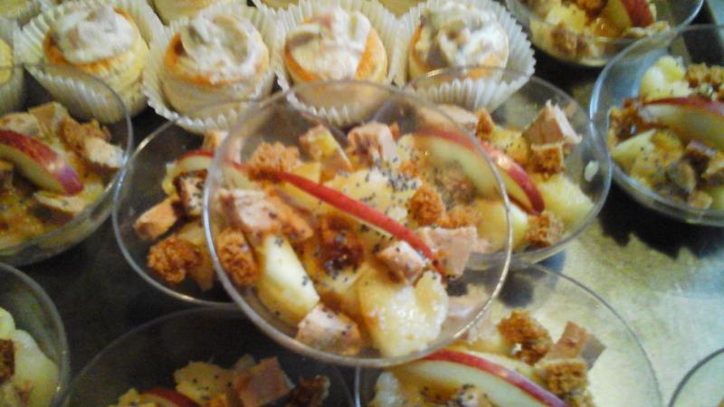 Nous faisons juste les apéritables Le reste vient du traiteur Coupelles pommes revenues dans beurre salé Dès de foie gras et pain d'épice Mini bouchées reine