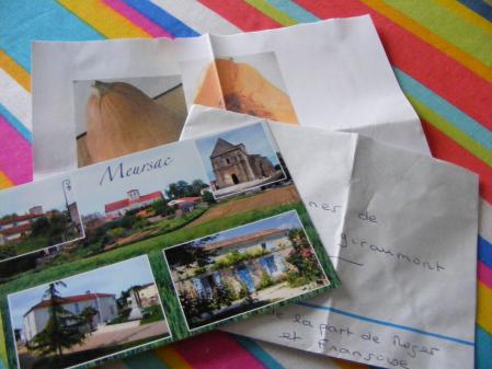 une jolie carte postale de Meursac un joli village ou je pense il fait bon vivre la preuve par ce geste ..... ça c vraiment sympa de m'envoyer ces graines de courges de giraumont j'espére avoir la main jardinière pour pouvoir déguster ces courges à l'automne