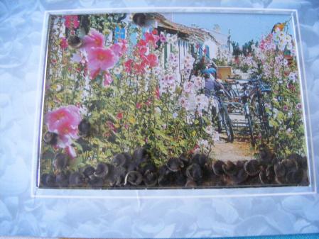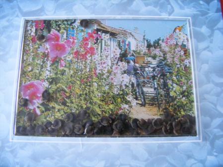 j'ai reçu de la part de Christiane des graines de roses trémières une jolie carte qui représente une ruelle égayée de roses trémières! fait des mains de Kiki et les graines sont à l'intérieur! joli idée que cette présentation! encore merçi et bon wk