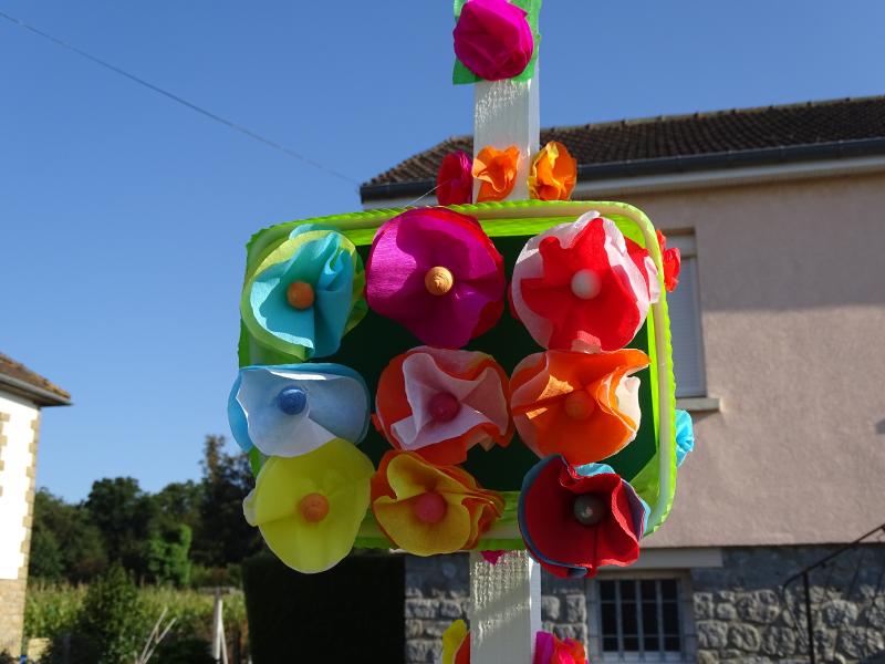 des feuilles découpées en rond multicolores des pailettes relié avec un fil dans les trous perforés par mon jardinier